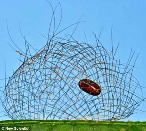 在这幅照片中,笼内的虫蛹已不属于毛虫,而是属于一只寄蝇,从里面将毛虫吃掉。现在的蛹安全地悬挂在潜在捕食者够不到的地方。摄影师Damon Wilder