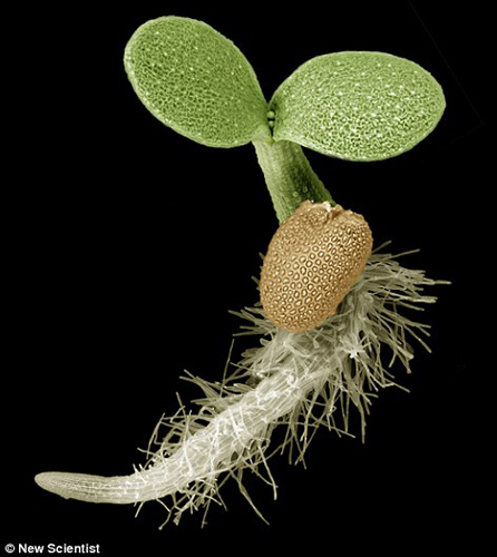 6天大的拟南芥幼苗,由摄影师Mark Talbo使用扫描电子显微镜拍摄,然后手工上色而成。