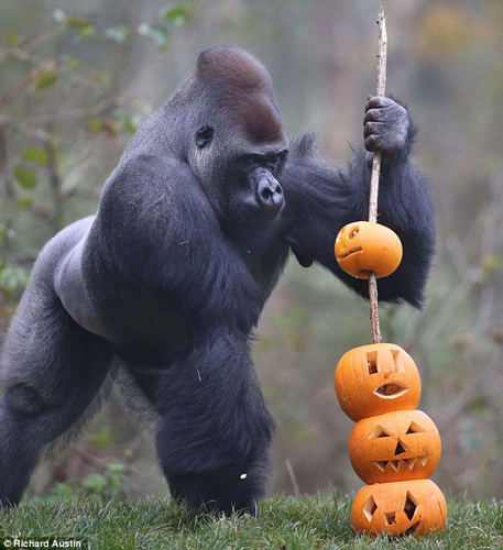 相比这只松鼠无心插柳柳成荫所上演的“恶作剧”,近日英国德文郡一座动物园的一只大猩猩却显然不知趣,没有玩心,将公园工作人员为它准备的一串南瓜雕刻弄碎,然后扔到领地以外。