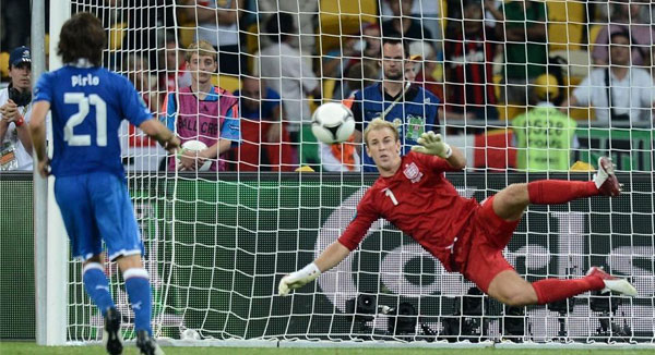 2012年欧洲杯四分之一决赛,点球大战,意大利已经1-2落后于英格兰。安德鲁•皮尔洛走上罚球点前,他前面出场的队友里卡多•蒙托利沃已经错失一次良机。就是在如此紧张的压力下,皮尔洛竟然打入“勺子点球”,成为一个值得纪念的转折点。意大利最终4-2赢得点球大战,进军半决赛。
