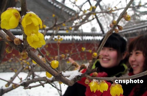 2月18日,北京喜降小雪,在北京植物园卧佛寺皑皑白雪中一朵朵蜡梅不畏严寒绽放,吸引众多游客前来观赏。中新社发 钱兴强 摄