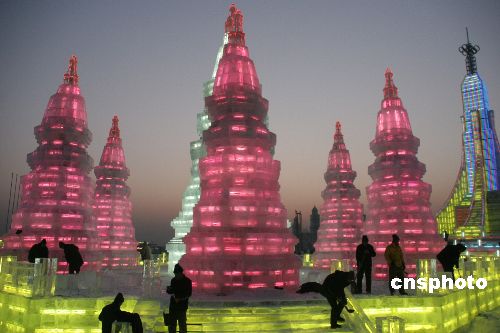 第九届哈尔滨冰雪大世界经过万余建设人员夜以继日的努力工作,12月21日全部冰景建设已基本完成,目前正在进行冰景试灯和园区的清理工作,据冰雪大世界工程建设总指挥、马迭尔集团董事长刘瑞强介绍,今年虽然在建设上遇到了一些困难,但是,经过全体建设人员的努力,实际建设工期已经缩短,二十三日晚试开园,比预计开园时间提前了一天。本届冰雪大世界以冰雪世界、奥运梦想为主题,在总体上突破性地采用最简洁的跑道形式明确游览路线,跑道和冰道相结合,既是游览路线,还是溜冰场,将5个主题景区紧密联系起来。在跑道周边,是代表体育形象、表现奥运历史、奥运逸事,以及参加奥运会的各国国旗、吉祥物、标志组成的冰雕雪塑,体现和谐世界,紧扣奥运主题。中新社发 王忠言 摄