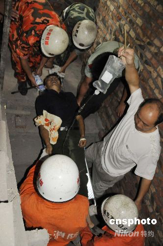 8月4日,四川南充市一建筑工地,一名民工不慎从架上摔下,致使一根约2公分粗的纲钎从头部右侧插入大脑,生命垂危。事发后,当地消防官兵、医务人员奋力营救。救援人员在实施现场急救的同时,将钢钎局部切断后将这名民工送往医院抢救,经医务人员3个多小时的手术,最终成功将插入民工头部的钢钎取出。中新社发 肖洪环 摄