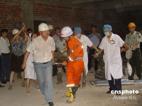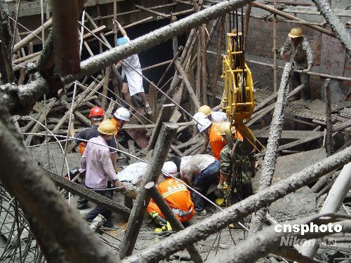 九月十日下午四时许,广西崇左市人民医院在建大楼中庭天面楼板发生坍塌,六名施工人员从五楼摔下,共造成八人被埋压。目前伤者已全部送往医院抢救。图为崇左消防官兵和工地工人在现场救援。中新社发 黄清梅 摄