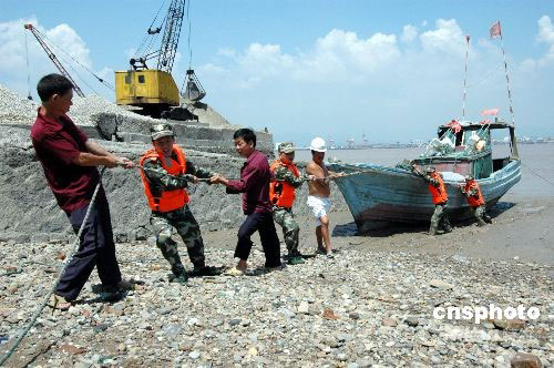 9月11日,浙江省温州市气象台发布的强台风消息和沿海大风警报:今年第13号强台风“森拉克”,上午8时中心位置已经到达温州东南偏南方向大约870公里的海面上。面对来势汹汹的强台风“森拉克”,温州边防支队迅速启动防台工作预案,提醒海上作业船舶及时进港避风,并帮助群众提前做好各项防御准备工作。中新社发 吴水斌 摄
