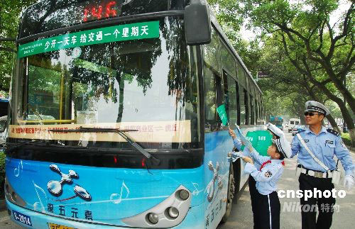 2008年9月22日,苏州市东中市实验小学的小交警和苏州平江交巡警大队的民警共同制作了公交出行指南和“无车日”宣传材料在街头散发,小交警们号召大家“少开一天车·给交通一个星期天”。并积极倡导市民选择以骑自行车、乘公交车以及步行等“绿色出行”方式出行。 中新社发 朱子寒 摄