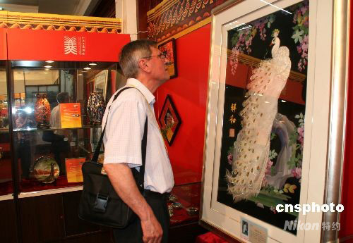 图为英国伯明翰国家博物馆官长Peter Wai观看工艺精品展。