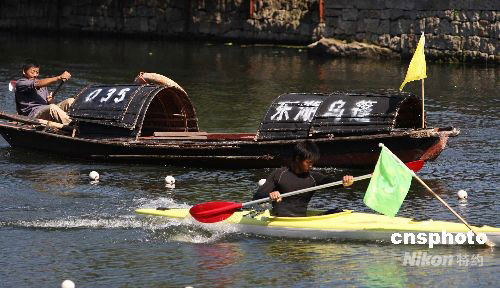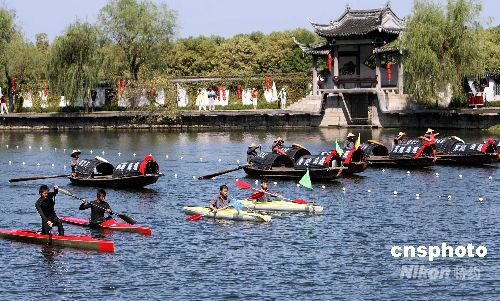 9月25日,绍兴东湖景区内举行乌篷船与皮划艇比赛。当日,为期一个月的2008中国绍兴乌篷船风情节在浙江绍兴拉开帷幕。乌篷船是绍兴特有的水上交通工具,在奥运会上蝉联双人划艇冠军的孟关良是绍兴东湖人,从小就划乌篷船,可以说乌篷船划出了奥运冠军。乌篷船风情节以“一船乌篷风情,一朝醉游绍兴”主题。中新社发 袁云 摄