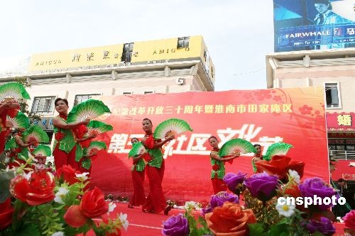 10月27日,安徽省淮南市利用社区有利资源,开展形式多样的文化活动。群众们走上舞台,自发自编自导自演各类节目,不但秀出了自己的风采,还丰富了社区文化生活,受到广泛好评。图为群众们在社区舞台上表演节目。中新社发 张娅子 摄