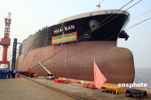 10月27日,上海外高桥造船公司为新加坡海洋油船有限公司建造的31.8万载重吨“华山”号油轮提前5个月命名交船。这是目前世界上第一艘全面满足国际船级社协会(IACS)最新《共同结构规范》的载重吨最大、款式最新的绿色环保型超级油轮。“华山”号船长333米,型宽60米,型深30.5米,设计吃水21米,航速为16.1节,续航力约29000海里。中新社发 潘索菲 摄