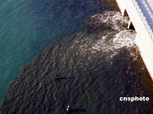 2008年11月24日,湖北宜昌市长江铁路大桥北岸桥墩上游约50米处,两个人工涵洞不停地向长江“吐”着墨汁般的污水,染黑一片江水。中新社发 蒲新阳 摄