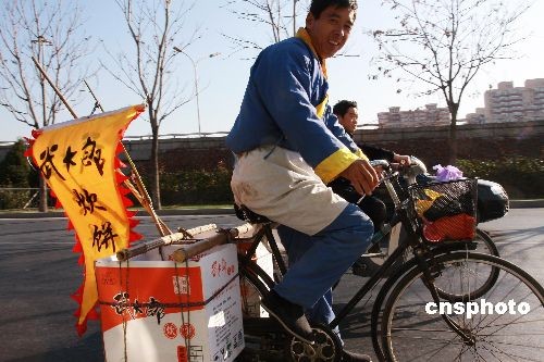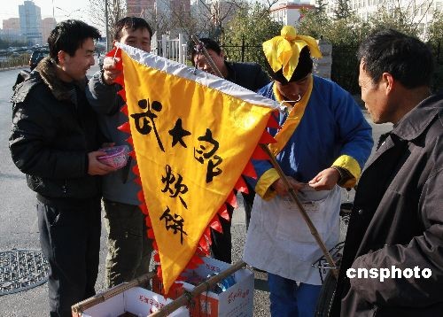 11月25日,寒风中,“武大郎”惊现北京街头。随着金融危机的加剧,北京街头小摊贩出新招,以传统挂“招牌”的方式流动营业招揽生意来度过眼前的经济危机,现代都市中的“武大郎”成为冬日街头的一个亮点。中新社发 郑雄增 摄