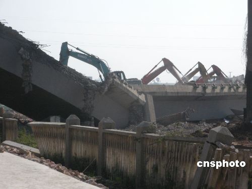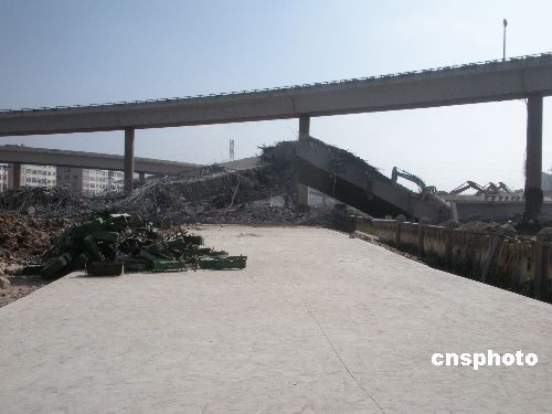 12月9日19时30分许,正在进行改扩建的昆明市北市区小庄立交桥部分匝道突然发生垮塌,垮塌桥面约200米左右,事故造成2人死亡、4人受伤,事故原因初步查明系施工单位违反操作规程所致。图为10日上午事故现场挖掘机正在清理坍塌的立交桥。中新社发 蒋晨 摄