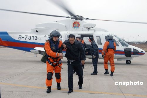 12月10日3时30分,交通运输部北海第一救助飞行队蓬莱救助值班室接到唐山海上搜救中心电话:在唐山附近海域一运沙船船体进水倾斜,船上六人,由于海上风浪太大,船员准备弃船,需直升机前去救助。飞行队一架救助直升机紧急从蓬莱飞行救助基地起飞直奔救助区域。当时海上风力九到十级,浪高达四到五米。此时遇险船只已严重倾斜,船舱进水,六名船员聚集到二层甲板等待救援。机组人员立即救援,救生员王军将六名遇险渔民成功救上直升机。上午10时,救助直升机顺利降落蓬莱基地。中新社发 王浩 摄