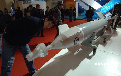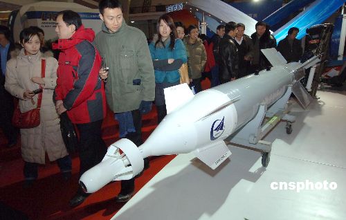 1月7日,“中国航空工业走向世界成就展”在北京展览馆隆重开幕,中国空军新式武器“激光制导炸弹”吸引大批市民关注。该展览是在中国航空百年和建国60周年之际,为展示改革开放以来中国航空工业对外开放和走向世界的光辉历程,由中国航空工业集团公司(AVIC)主办的。中新社发 邹宪 摄