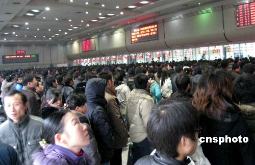 随着春节的临近,浙江各地迎来售票高峰期。1月8日上午11点的杭州火车站,售票大厅所有开启的售票窗口前都排起蜿蜒数十米的购票队伍。中新社发 孙宁亚 摄