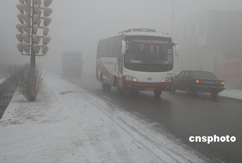 1月8日早晨,山东省枣庄市山亭区西集镇境内大雾弥漫。上午10点多钟,大雾中又飘起密密的雪花,附近的高速公路被关闭,车辆在雾雪中的公路上困难行使。 中新社发 赵连友 摄