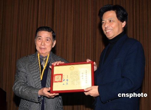 2月6日,“台湾发展研究院”代表吕永昌(左)在上海郑重地将“感谢状”提交给上海同济大学副校长董琦教授。据悉,自2001年起,已有4000多人次的台湾青年到上海同济大学研习中华文化,跨海短期求学风气正在台湾盛行。当日,来自台湾近40所大学的280位台湾青年学生在同济大学参加了寒假中华文化研习营开营仪式。中新社发 潘索菲 摄