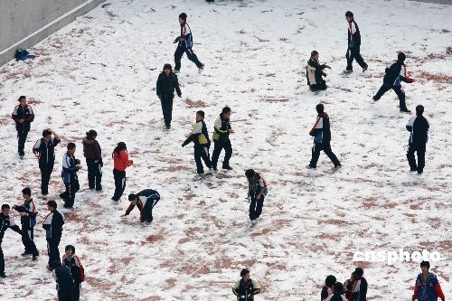 2月19日,连续三场春雪给北京市民带来不少欢乐,一群中学生在操场上打雪仗享受春雪带来的乐趣。中新社发 郑雄增 摄