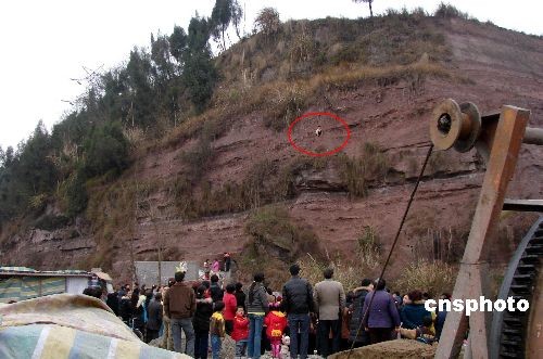2月18日傍晚,四川省南充市顺庆区金溪镇一名10岁小男孩,因看见路边山崖上悬挂着一支风筝,于是爬上崖摘取,随后风筝被风刮走,小男孩被困在上面上下不能,被困在山崖上3个小时后,被赶到现场的当地消防官兵成功救下。中新社发 法良 摄