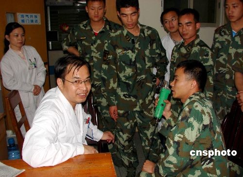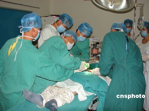广西玉林市玉州消防大队名山中队6名官兵,在玉林市红十字会医院为一老汉破拆紧套在“命根”上的小钢圈。中新社发 黄浩 摄