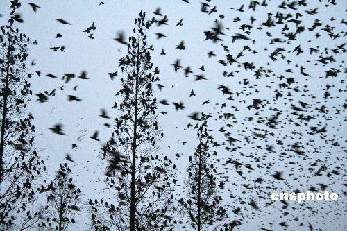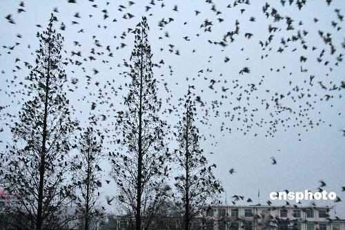 2月19日傍晚,河南省社旗县出现“万鸟投林”奇观。数以万计的麻雀、楼燕等飞鸟集结成群,从不同方向飞临县城一机关大院上空,几经盘旋后飞入林间栖息,景象蔚为奇观。据林业专家介绍,近年来,该县以“平原绿化高级达标”为载体,长期开展植树造林和护林爱鸟等生态保护活动,全县农田林网控制率达到了90%以上,沟、路、渠、河绿化率达到95%以上,村庄覆盖率达到40%以上,2008年社旗县顺利通过了省、市平原绿化高级达标验收,还被南阳市人民政府命名为“南阳市园林县城”。中新社发 宋同杰 摄