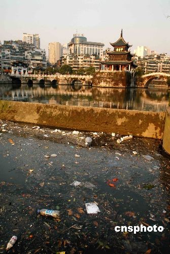 2009年2月24日,贵阳南明河,河水面垃圾成堆,又开始逐渐变黑发臭。自古以来,清澈见底的南明河一直是贵阳居民的直接饮用水源,两岸风光旖旎,是游玩的好地方。然而,从上世纪70年代开始,河水逐渐变黑发臭。到90年代南明河污染状况触目惊心。为还南明河以清净,还市民以优质的生活环境,贵阳市投资22亿元,从2001年开始用3年时间治理南明河污染基本完成,实现了水变清,岸变绿,景变美的目标。但是,几年后又见河水面垃圾成堆,河水又开始逐渐变黑发臭。中新社发 张天林 摄