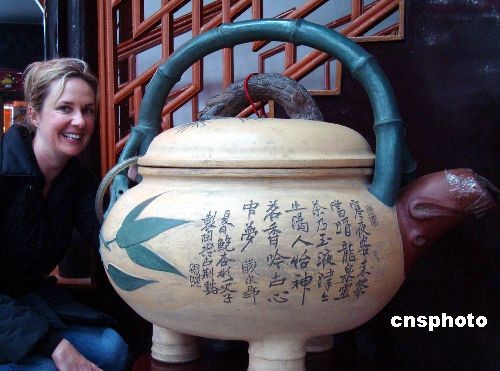 2月24日,外国游客在宜兴紫砂巨壶旁留影。近日,一把可供200人同饮的紫砂巨壶在苏州一家老字号商店内亮相。据了解,这把紫砂巨壶产自宜兴,壶高约100厘米,壶身直径约70厘米。中新社发 王建康 摄