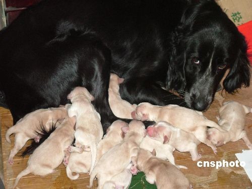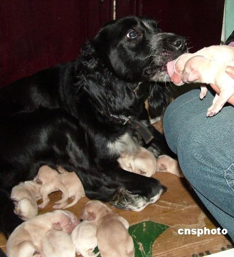图为2月25日拍摄的江苏镇江谏壁镇明先生家所养的史宾格猎犬和它所产的14只小狗崽。 据主人明先生介绍,他所养的史宾格猎犬是08年12月配的金毛犬种,2月22日晚上7时左右开始产崽,到零时左右共产下8只小崽,他们以为不会再产了,就回房睡觉,结果早晨起来一看,竟然产了14只,让他们大为惊奇。目前,14只小狗崽都非常健康可爱。据了解,母狗产下14只狗崽十分少见。中新社发 陶春 摄