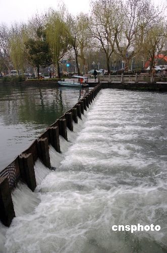 2月25日,杭州西湖开闸放水。连日阴雨使得杭州西湖水位上涨,当日,杭州少年宫附近的西湖圣塘闸开始开闸放水。中新社发 施健学 摄
