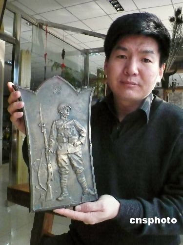 2月25日,黑龙江省收藏家协会会员、黑河铁路集团有限责任公司员工崔继周,在黑河聚艺堂与收藏爱好者交流日军侵华罪证铜牌的相关信息。这块铜牌是崔继周2001年在黑河市孙吴县三里丁村发现并收藏的,该村是日军侵华时期123师团驻孙吴指挥部。该铜牌高32厘米,制作于二十世纪三四十年代,外观呈樱花花瓣形状,四周有孔,起固定之用,为半机制半手工制作,画面的左侧有制作者“实三谨作”四字铭文。中新社发 邱齐龙 摄
