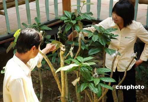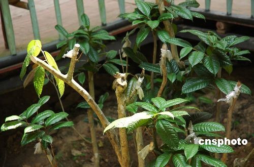 3月15日,技术人员正在查看“金花茶王”的长势。经过两年的悉心培育,广西十万大山魔石谷金花茶观赏园的一株“金花茶王”长出新叶,移栽成活。这株金花茶长有10个主干,最粗的主干直径约为7厘米。据专家介绍,这株金花茶已有300多年的树龄,这么老的金花茶在国内乃至全球都非常罕见,堪称“金花茶王”,其价值难以估算。 金花茶是山茶花家族中惟一具有金黄色花瓣的种类,分布极其狭窄,全世界90%的野生金花茶仅分布于广西十万大山的兰山支脉一带。金花茶除具有很高观赏价值外,还是一种名贵药材,属国家一级保护植物,享有“茶族皇后”“植物界大熊猫”等美誉,是世界上稀有的珍贵植物。中新社发 梁富盈 摄