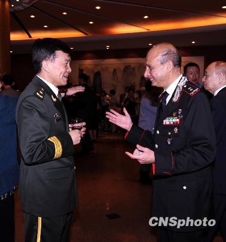 当地时间7月30日,中国驻联合国军事参谋团团长刘沛少将举行庆祝八一建军节82周年招待会,招待会在中国常驻联合国代表团驻地举行,联合国主管维和的副秘书长勒罗伊、各国驻联合国军事代表及驻纽约的武官、联合国工作人员和侨界闻人300人出席招待会。图为刘沛团长与意大利驻联合国军事代表交谈。中新社发 龚文谟 摄