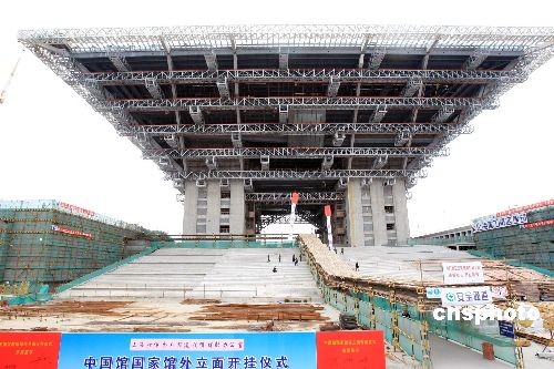 5月25日,2010年上海世博会中国馆“东方之冠”正式吊装具有浓郁中国色彩的“中国红”外立面,开始进入为期两个月的外立面挂板作业。中新社发 汤彦俊 摄
