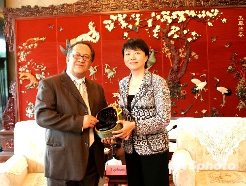 9月27日,扬州市委书记王燕文(右)在迎宾馆会见应邀来扬参加第三届中国扬州世界运河名城博览会的印度尼西亚文化旅游部市场副部长Sapta Nirwandar先生(左),双方表示加强在经济、文化、旅游等各领域的交流与合作。中新社发 崔佳明 摄