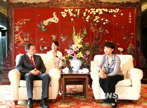 9月27日,扬州市委书记王燕文(右)在迎宾馆会见应邀来扬参加第三届中国扬州世界运河名城博览会的德国奥芬巴赫市经济开发局长米歇尔·多尔先生(左)。扬州市与德国奥芬巴赫市自1997年结为友好城市以来,两市在经济、文化、体育等领域开展了一系列的交流与合作,取得了丰硕的成果,加深了彼此间的了解和友谊。中新社发 崔佳明 摄