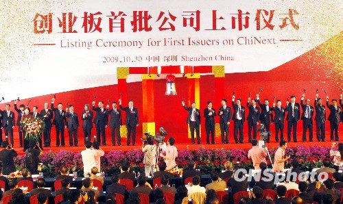 10月30日,“创业板首批公司上市仪式”在深圳市五洲宾馆举行,首批28家公司同时在深交所挂牌交易,央行行长周小川等出席仪式并致辞。中新社发 陈文 摄