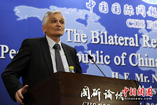 5月7日,波黑部长会议主席尼科拉·什皮里奇走进中国国际问题研究所“国研论坛”发表演讲,尼科拉·什皮里奇从双边贸易与投资的角度谈了中国波黑双边关系,并回答了与会记者的提问。中新社发 刘震 摄