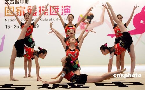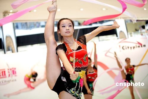 七月十六日,为迎接香港举办的东亚运动会,延续北京奥运热潮。香港太古城特邀北京及广州大专体院的体操精英队员为市民表演,两队共十九名选手以充满活力的动作展演精湛艺术体操技巧。中新社发 洪少葵 摄