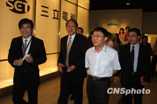 7月29日上午,由海协会专家、国务院台办新闻局局长杨毅(前右)率领的海协会新闻交流团参访了台湾三立电视台,受到三立电视台总经理张荣华(左)等人的热情接待。中新社发 董会峰 摄