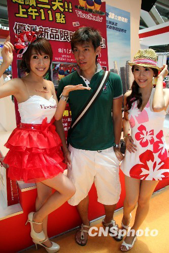 7月30日,暑期台湾最大的电脑展台北电脑应用展在世贸一馆登场,各参展厂商纷纷出招拉抬买气,而名模、艺人、辣妹代言,成为最吸引观众的“利器”。图为某摊位前的帅哥美女。中新社发 董会峰 摄