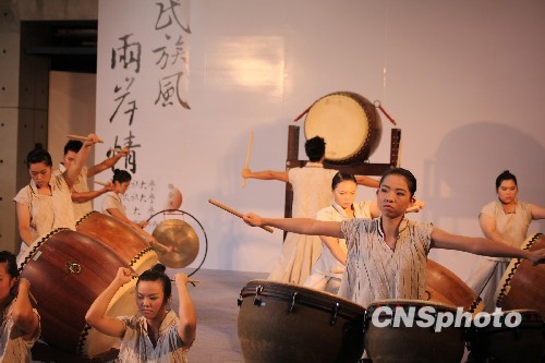 9月23日,以中央民族大学与西南民族大学为主体的大陆少数民族大学生文化交流团一行120余人,出现在台湾实践大学校园内,以载歌载舞的方式与当地学生进行文化交流。在接下来的两周时间里,他们陆续在台北、台中和金门等地进行多场演出。其中,9月25、26两日在台北举行的两场“民族风两岸情”灾后重建关怀演出,所有演出售票所得将全数捐作赈灾之用。图为台湾实践大学鼓艺代表队表演的迎宾礼。中新社发 李佳佳 摄