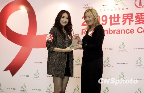 十二月一日,为纪念“世界艾滋病日”,爱滋宁养服务协会在香港举行“世界艾滋病日”纪念典礼,邀请了歌手吴雨霏(左)为特别大使,宣扬防治艾滋病的正确观念。中新社发 张勤 摄