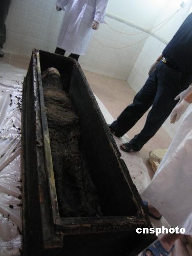 6月9日,一口广西十万大山的古巨棺获抢救性发掘,古棺内底部呈现“北斗七星”图案。6月10日上午,有关专家将古棺内保存完整的尸骸采用现代医学手段进行拍片,以便对其作进一步分析。有专家指出,这口古巨棺极有可能是明代产物。中新社发 杨强 摄