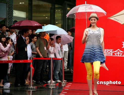 5月16日,模特在雨中展示时装。当日,南京一商家在门前广场冒雨举行原创T恤等时装展示活动,吸引了众多市民的眼球,为雨中南京增添一道风景。中新社发 钟山 摄