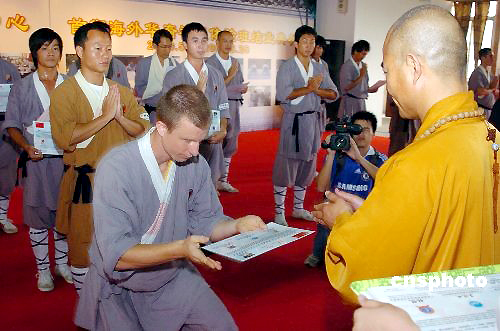 5月25日,国际禅武联盟名誉主席、少林寺武僧总教练释德扬大师,为“首期海外华裔禅武体验班”的学员颁发结业证书。来自匈牙利、葡萄牙、马来西亚等11个国家的28名“首期海外华裔禅武体验班”的学员,在广州“中华文化传承基地·禅武中心”的体验学习后,当日圆满结业。 中新社发 罗仰明 摄