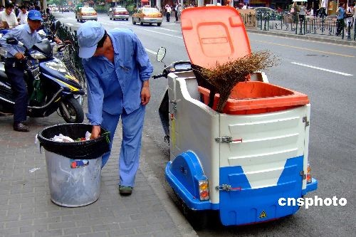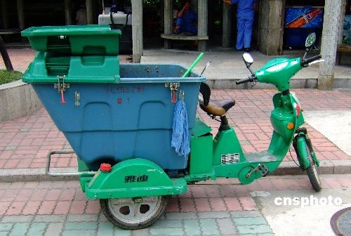 2009年7月16日,各色新款机动垃圾车、扫街车出现上海街头,代替旧式脚踏黄鱼车型垃圾车。新款车机轻便环保,无污染无扬尘,并且美观大方悦人眼目。 中新社发 蒋振雄 摄
