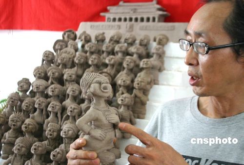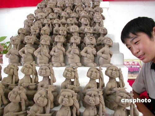 7月16日消息,苏州泥雕艺人倪同虎制作的“我爱北京天安门”泥塑作品吸引了市民的眼球。作品通过56个民族的妇女代表分成8排在天安门城楼下共同歌唱,表达对祖国60华诞的祝福之情。据了解,这幅作品花了整整三个月的时间,作品除了使用紫砂泥,还融进了取自20多个省份的泥土,象征民族的融合、团结、和谐。中新社发 苏成 摄