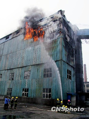 7月29日14时,山东海化某化工公司10号煤仓突发大火,枣庄消防调集滕州、市中、峄城、台儿庄等区市消防大队及特勤、国泰消防中队的16台消防车,110余名消防官兵前往救援。大火在当日16时左右被扑灭,多台生产设备被烧毁,所幸并无人员伤亡。中新社发 季宪路 摄