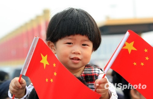 9月27日,在北京天安门广场上,一名刚满2岁的儿童手挥国旗迎国庆。随着新中国成立60周年庆典日益临近,天安门广场成为了中外游客的旅游胜地。中新社发 汤彦俊 摄